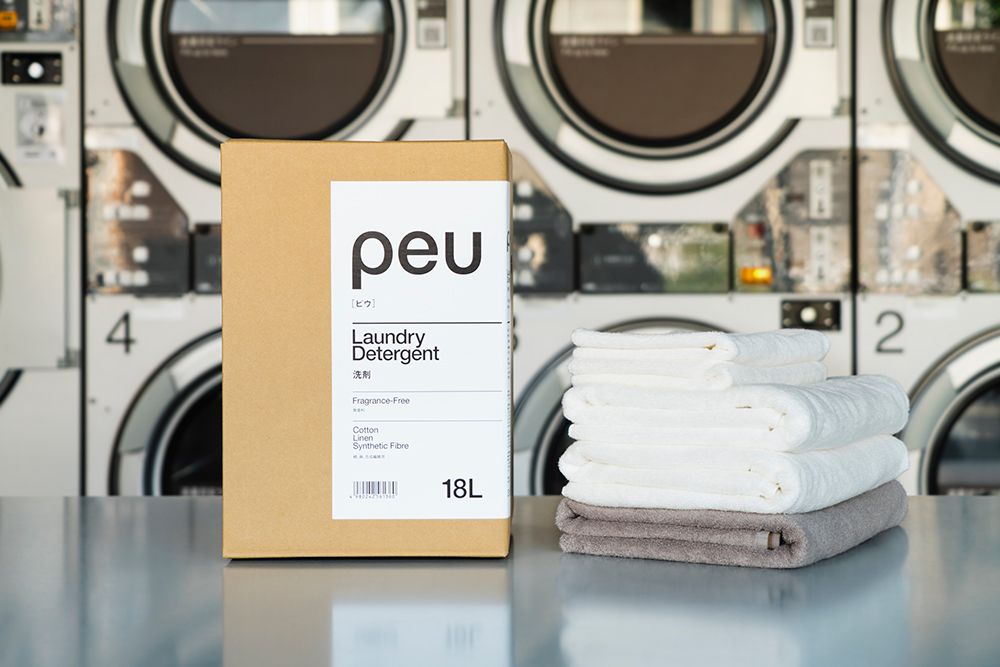 「LAVO LAUNDRY」では、OKULABが開発したオリジナル洗剤・柔軟剤「peu(ピウ)」を使用しています。植物由来の合成界面活性剤と天然の純石けん分から作られたpeuは、衣類をすっきりと洗い上げ、不要な成分を繊維に残しません。